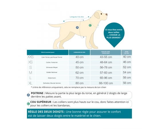 - Consultez notre guide des tailles pour trouver la taille parfaite pour votre chien
