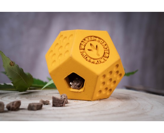 Sa forme géométrique originale procure un plaisir sur le long terme à votre compagnon à quatre pattes. Fabriquée en caoutchouc naturel très résistant. Le jouet rebondit dans des directions imprévisibles et peut également être utilisé comme "balle" pour aller chercher. Grâce à sa fente, il distribue lentement les friandises qui y sont cachées. Sa texture particulière procure une sensation de plaisir supplémentaire aux dents et gencives de votre chien. Disponibles en 4 couleurs !
