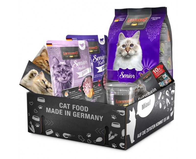 Offrez à votre chat senior une alimentation savoureuse, équilibrée et parfaitement adaptée à ses besoins grâce au coffret découverte LEONARDO® Senior !